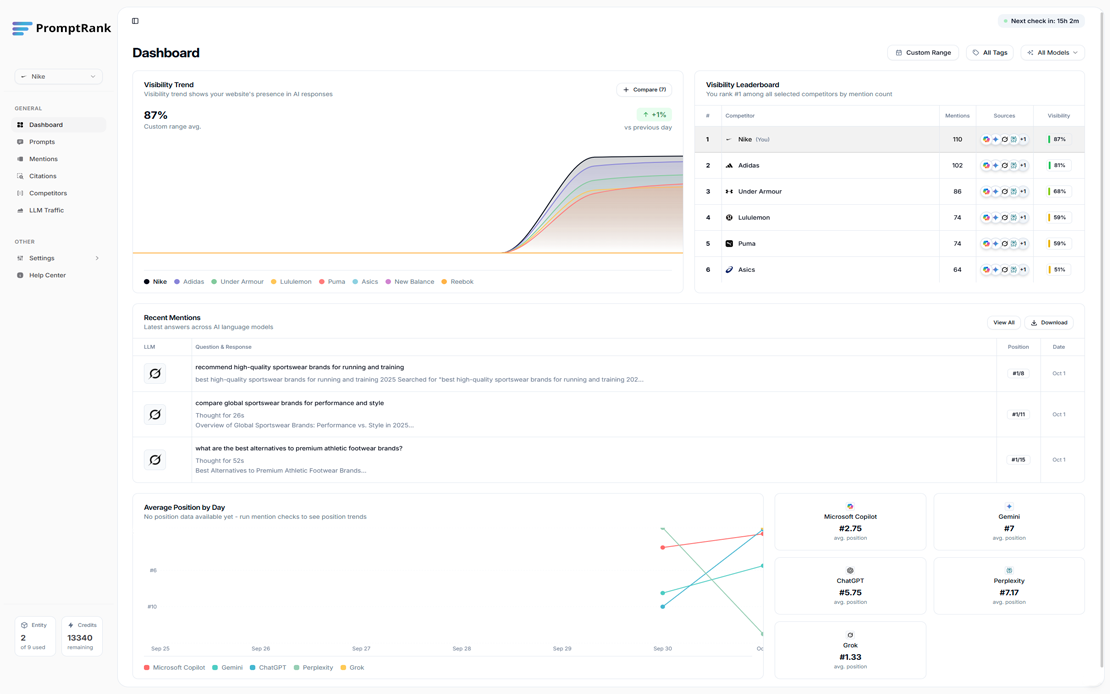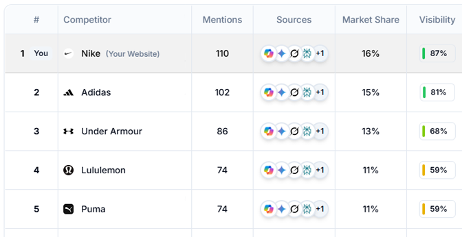 Compare your visibility side-by-side with competitors. Spot gaps and take action to close them fast.